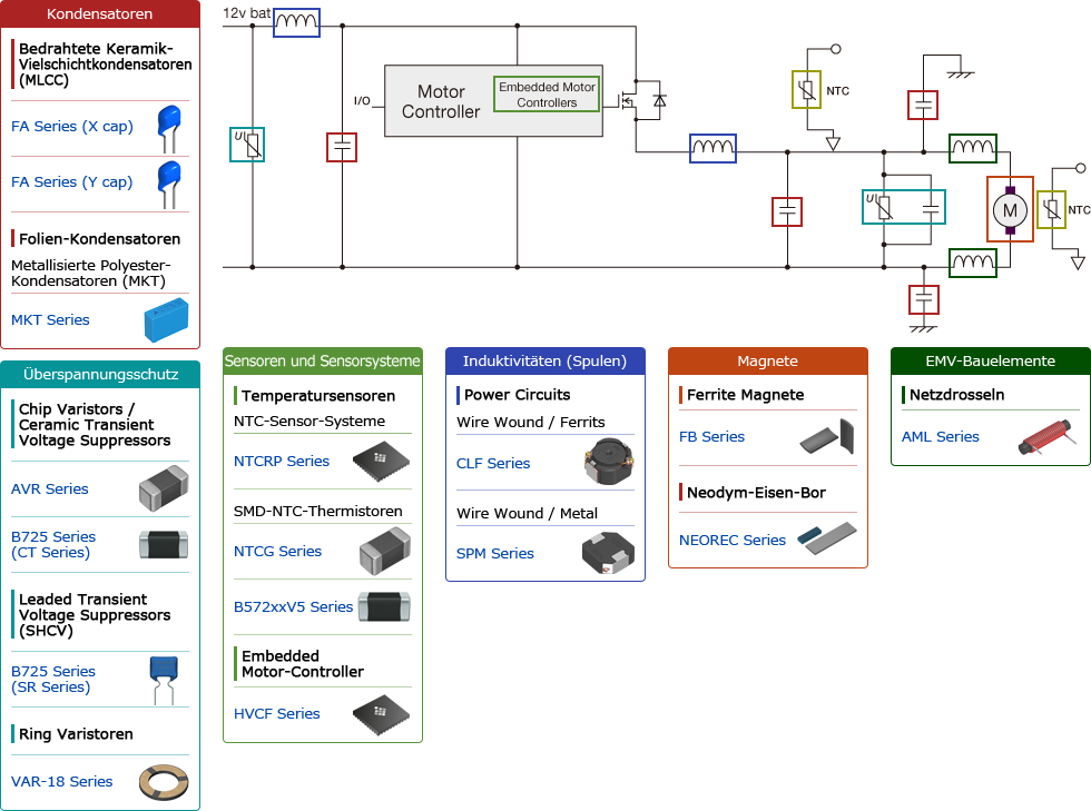 Gibt einen Überblick über Produkte der TDK-Gruppe für Stellantrieb für Bürstenmotor im Fahrzeug-Antriebsstrang.