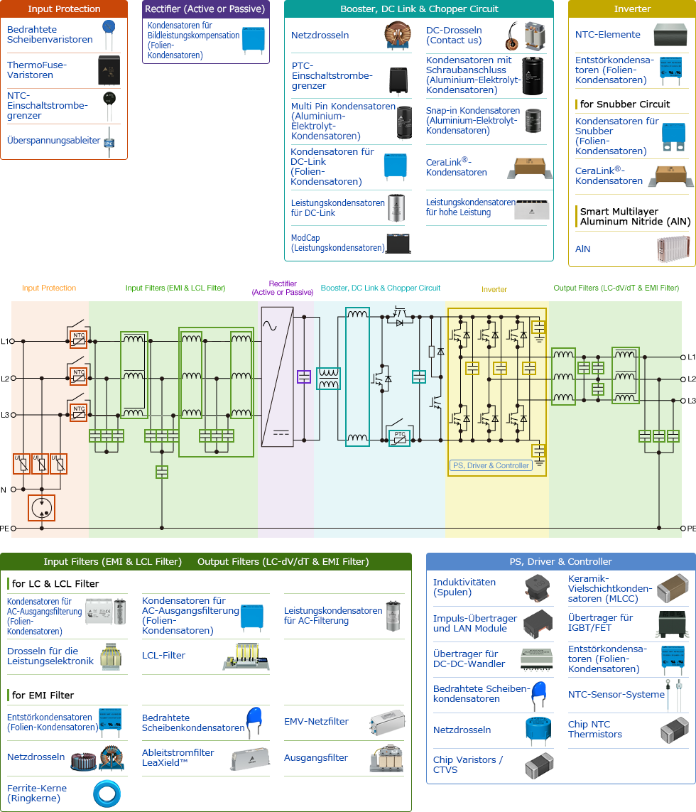 Gibt einen Überblick über Produkte für Frequenzumrichter-Anwendungen aus dem reichhaltigen Portfolio der TDK-Gruppe.