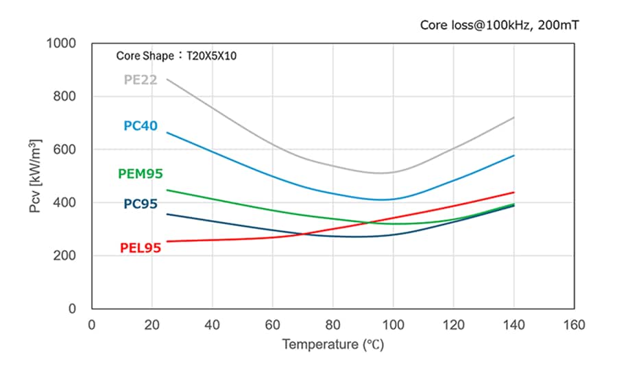*Since the optimal material varies depending on operating frequency, Bm, and core shape, it is recommended to conduct comparative evaluations among the 3 materials, PC95, PEL95, and PEM95, when considering your choice.
