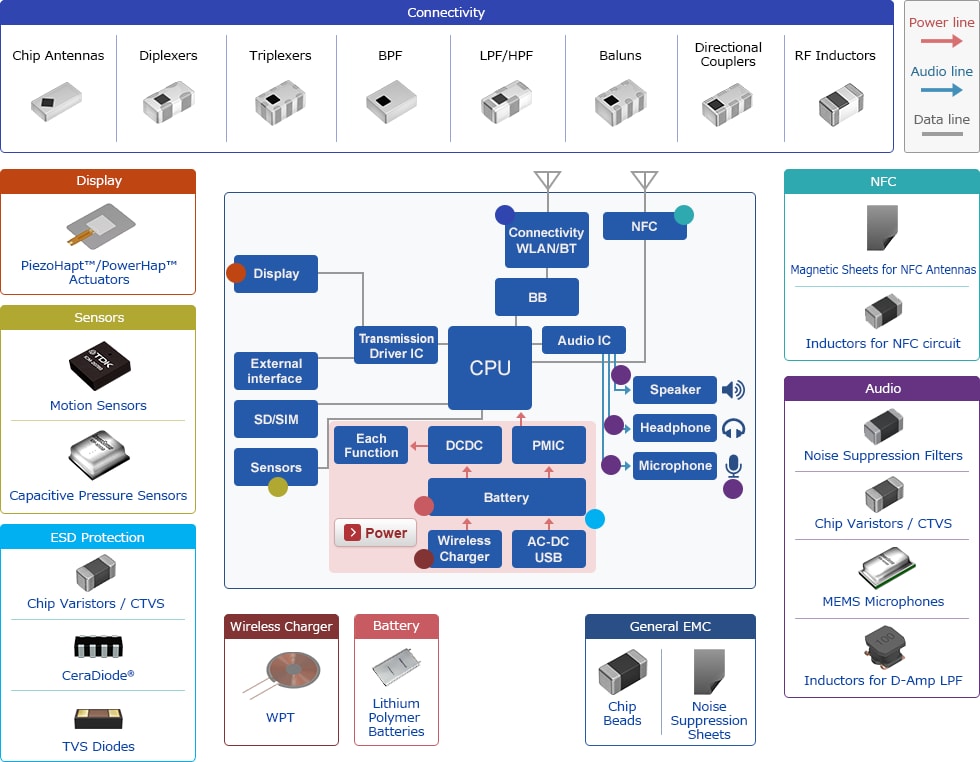 TDK offers you a wide variety of RF, Sensor, Audio and Magnetics building blocks for Smart Speakers applications. For example RF Filters, Chip Antennas, Motion Sensors, Capacitive Pressure Sensors, Noise Suppression Filters, Chip Varistors, MEMS Microphones, D-Amp LPF, Power and RF Inductors.