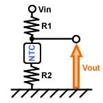 - You can adjust Vout by adjusting R1, R2 & R3. (R1:High temp. side, R2:Low temp. side) Vout decreases with temperature rise. Also, self-heating of the thermistor can be reduced.