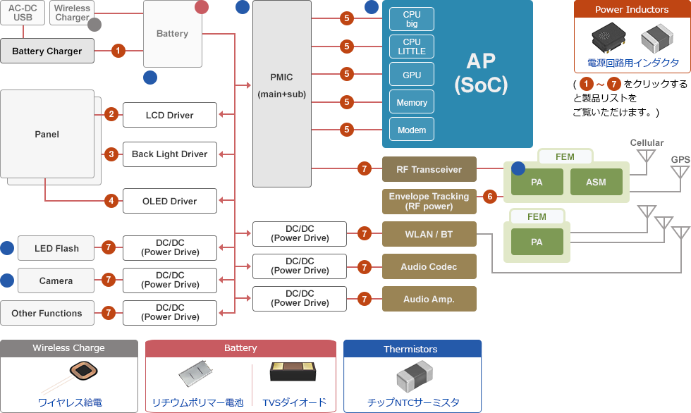 スマートフォン・タブレットの電源機能に使用されるパワーインダクタやチップNTCサーミスタなどをご紹介致します。