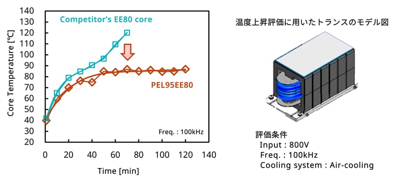 PEL95材のフェライトコアは大型形状において発熱を抑えることが可能です。