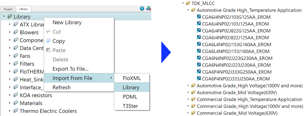 Simcenter Flotherm上で「ライブラリ」フォルダを右クリックして、「ファイルからのインポート」より、ダウンロードした.libraryファイルを選択してください。ライブラリ内にモデルライブラリがインポートされます。