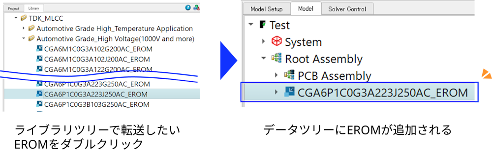 ライブラリツリー上でインポートしたライブラリを選択します。使用したい品名のEROMをダブルクリックすると、データツリーに追加されます。